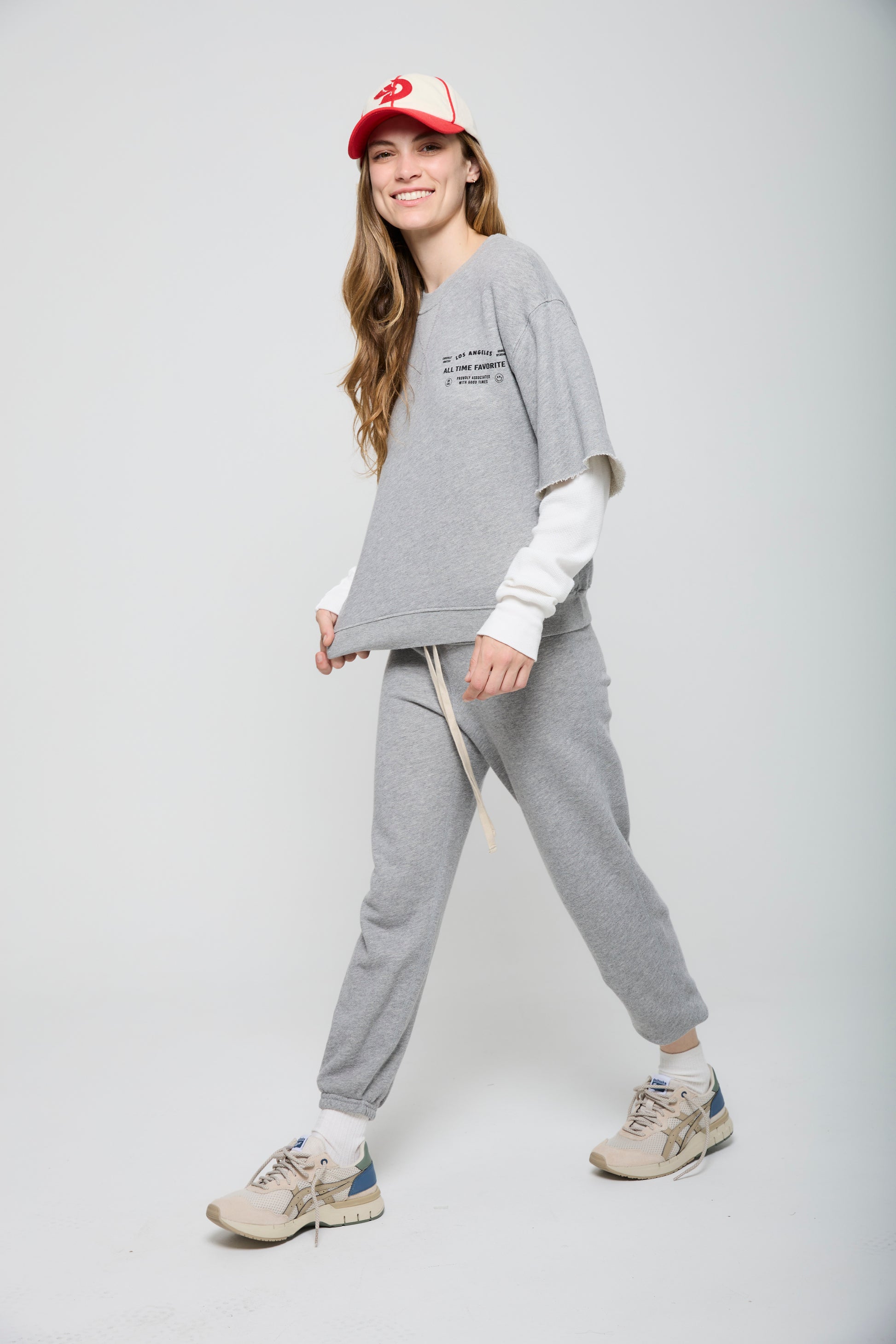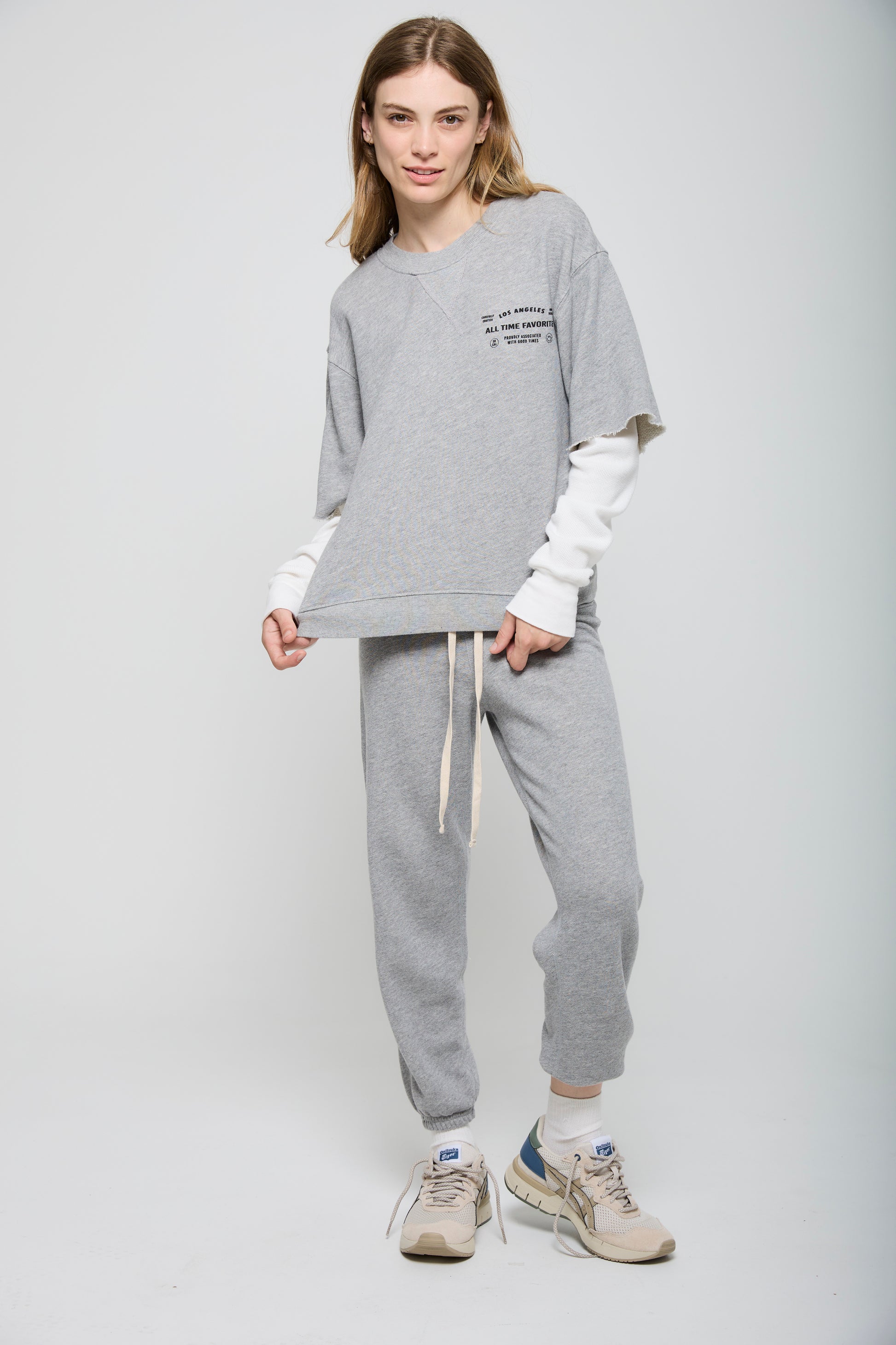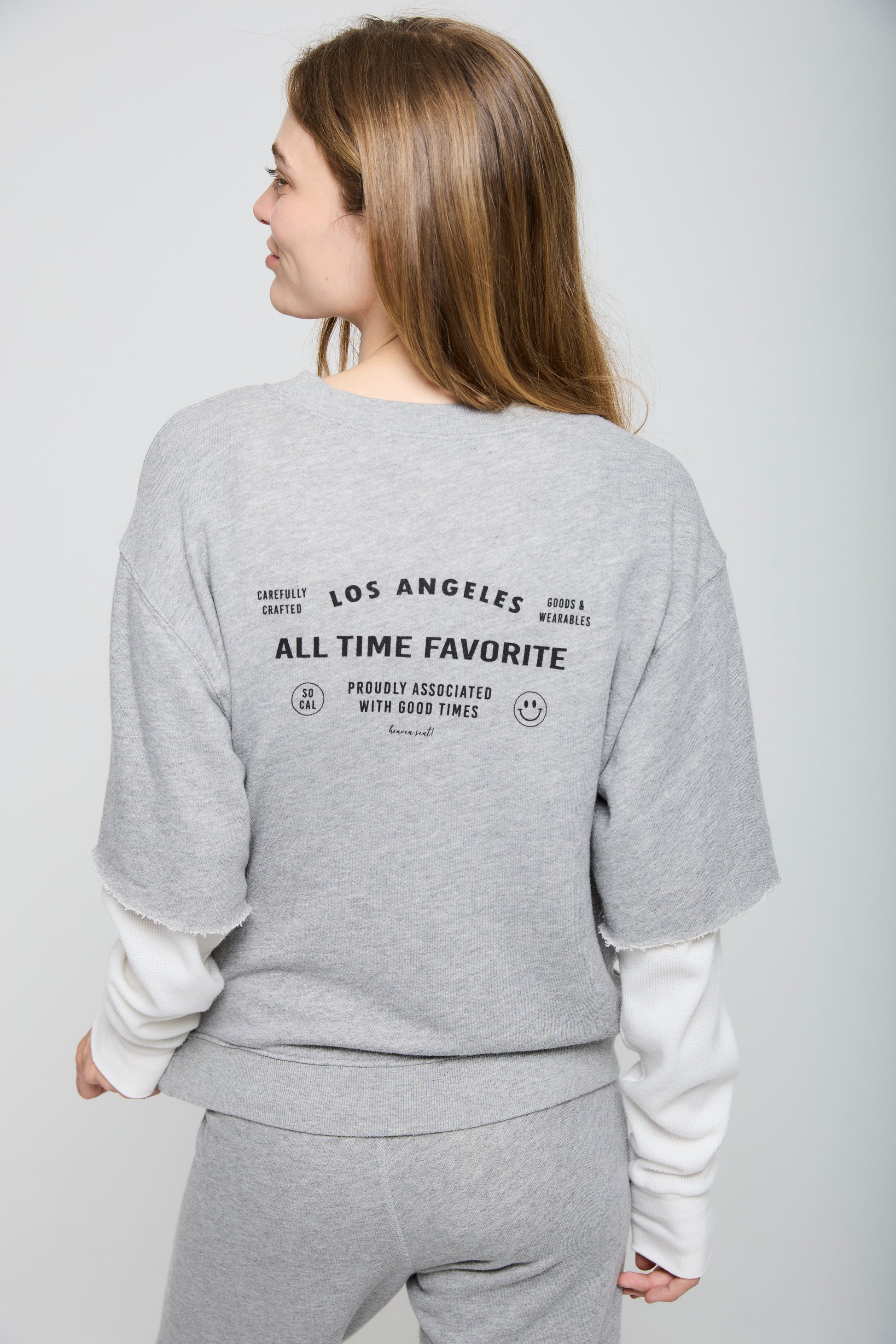 Proudly Associated - Our Proudly Associated sweatshirt combines comfort and style with a unique layered design. Made from soft heathered grey French terry, it features a built-in layered white thermal sleeve for a cool, casual look. The chest hit showcases the "All Time Favorite" logo paired with the phrase "Proudly Associated with Good Times", highlighting its Los Angeles and SoCal roots. The same graphic is printed larger on the back for added flair.